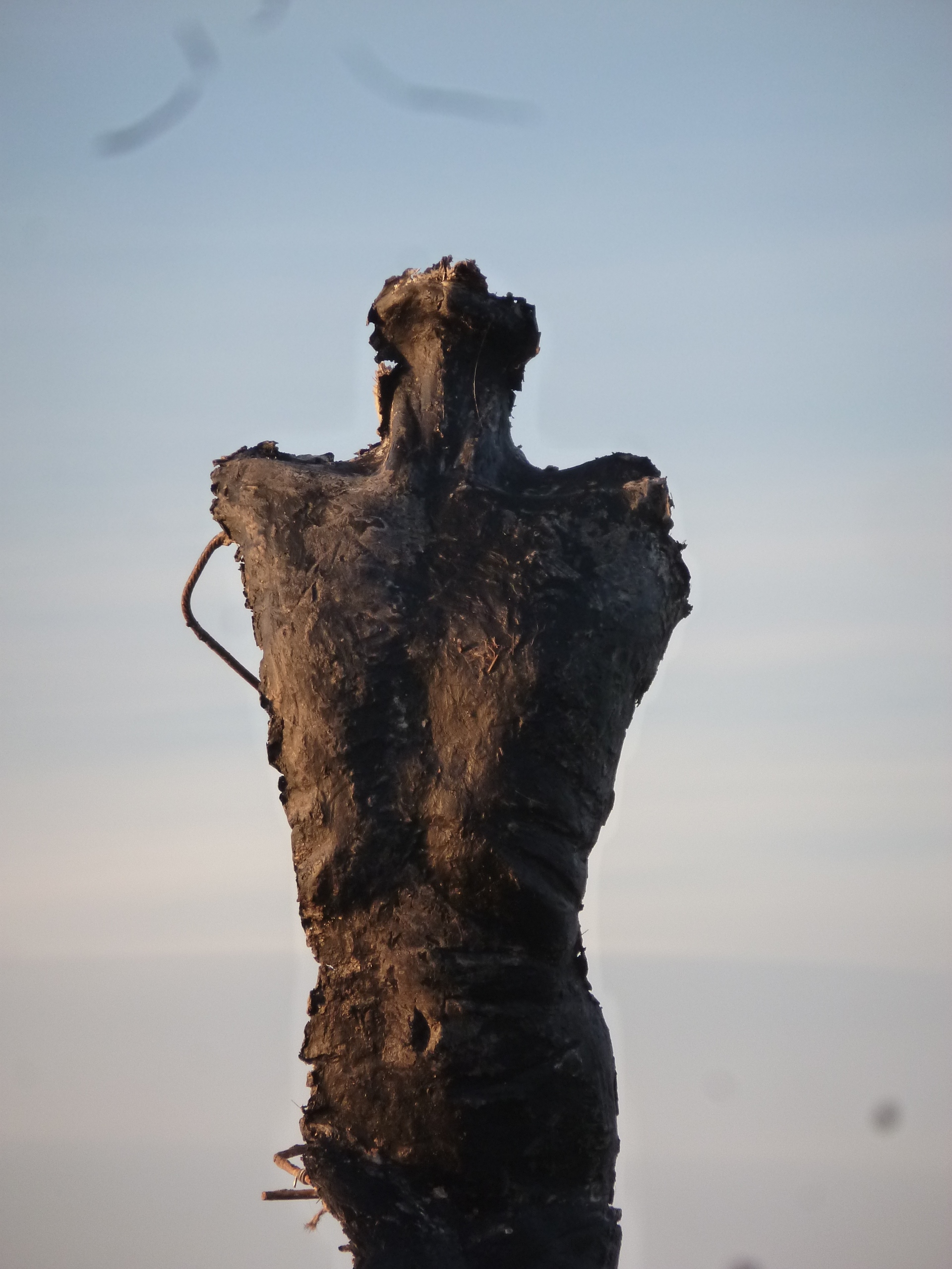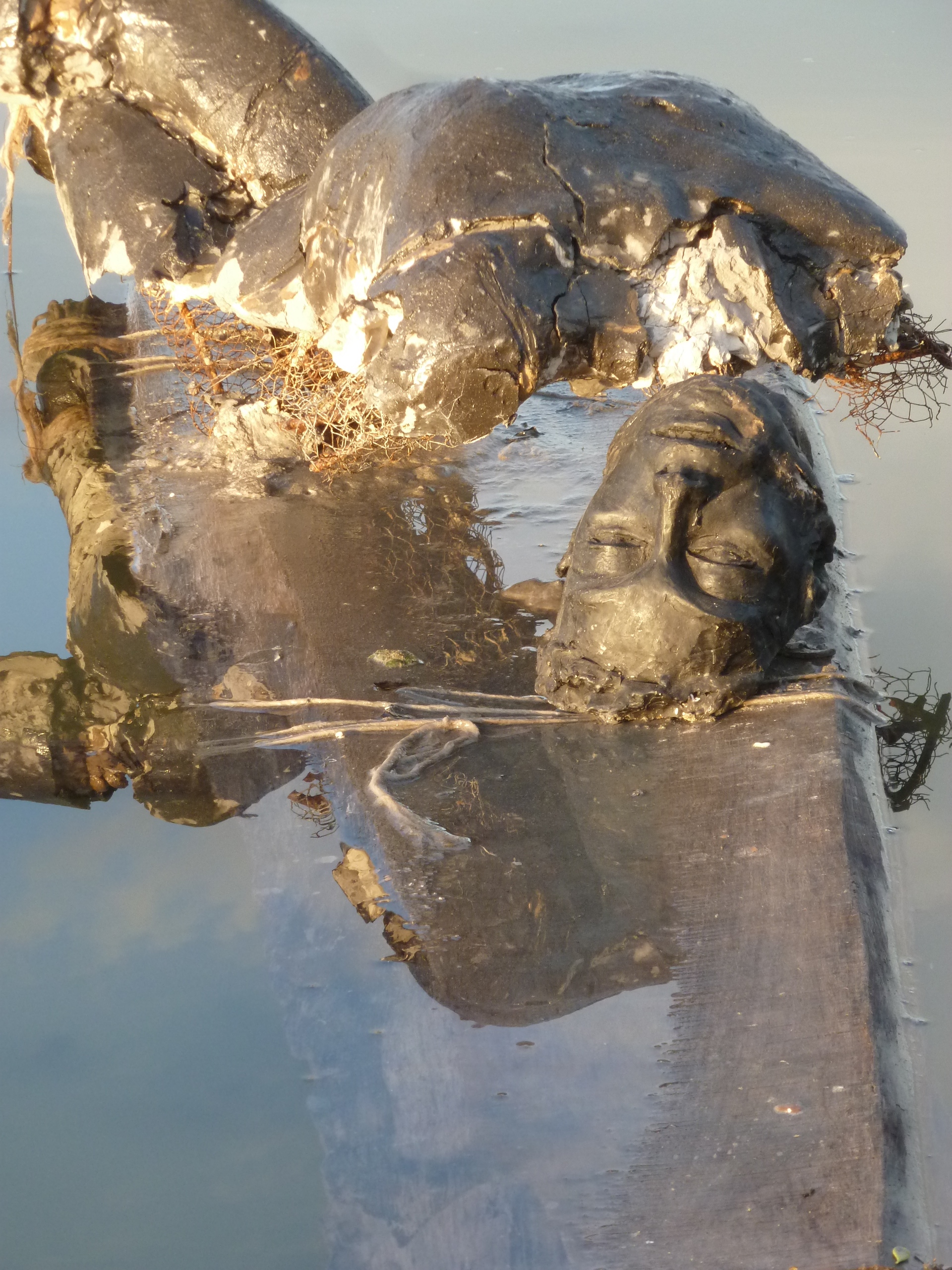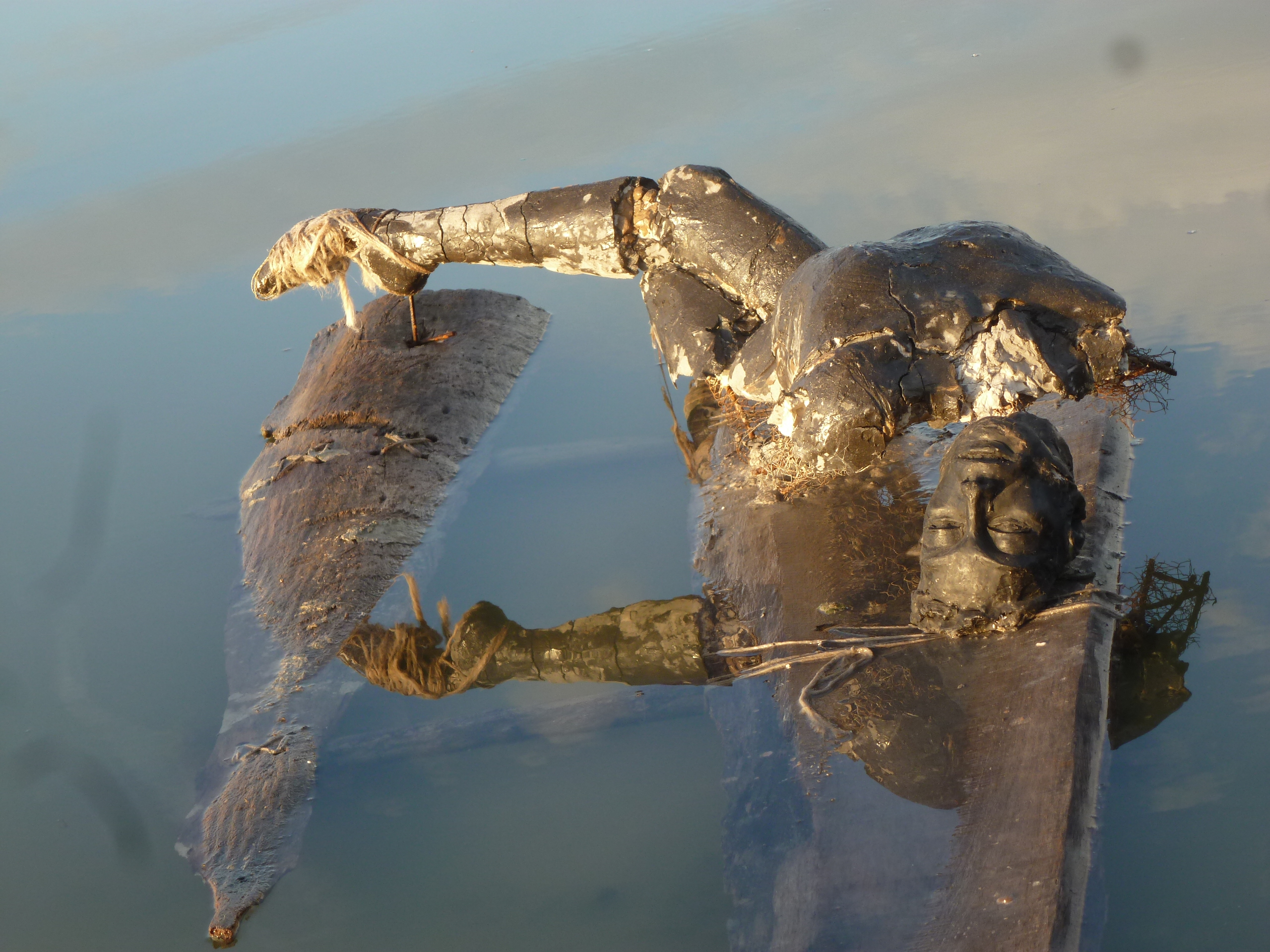 Sur son embarcation,l’érosion naturelle de l’eau opère sur la terre crue à la manière du temps. Qui passe… Mais elle accélère aussi cette décomposition violemment comme peut agir le voyage périlleux sur celui qui choisit l’exil. Ici, ce corps en terre y perd sa tête ,en une nuit,la braque chavire, la tête immergée est diluée dans l’étang. Le lendemain, elle retrouve une tête de cire noire. Ce personnage se trouve fracturé en deux matériaux, son corps fait de la terre crue des espaces géographiques qu’il traverse et sa tête faite des fleurs butinées sur son passage. Une matière organique, l’autre minérale mais toute deux périssables. L’une résiste à la pluie, l’autre à la chaleur, toutes deux dans des temporalités contradictoires, érodées successivement par les éléments.