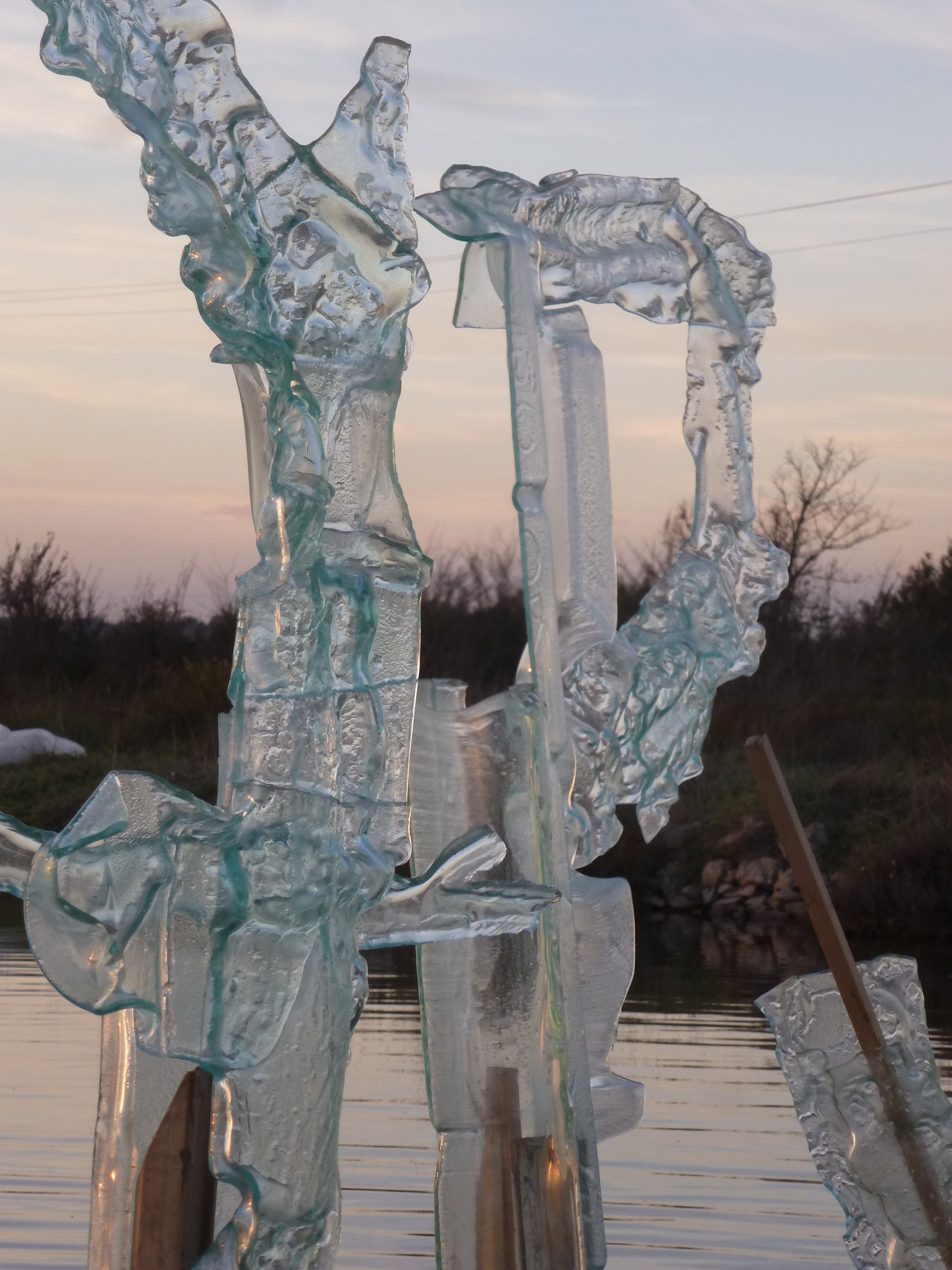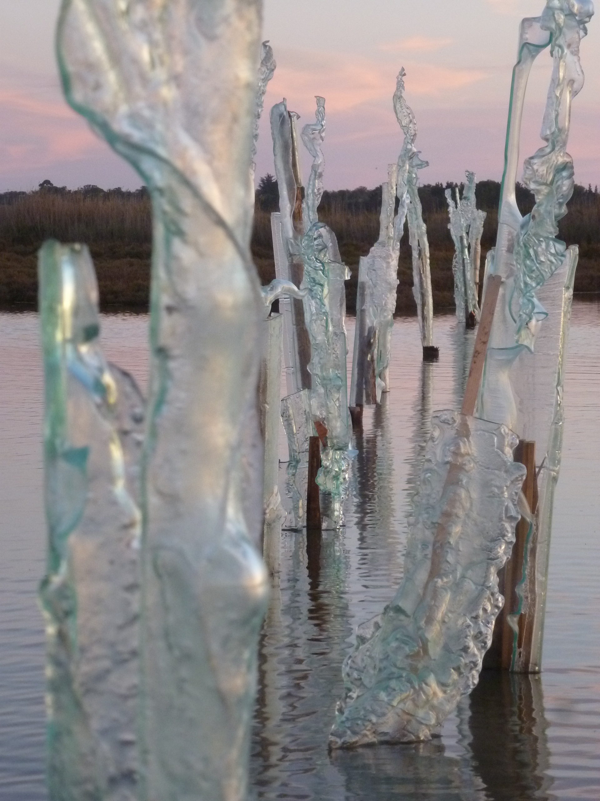 L’expression empruntée à la physique thermodynamique transition de phase semble être le lien entre la matière et nos obsessions. Il s’agit du passage d’un état à un autre : de liquide à gazeux, de gazeux à solide… moment où ça bascule de l’un à l’autre, à une température donnée, sous une pression donnée. Le projet que nous avons porté est l’écriture transparente de la transition – physique, chimique, paysagère. La mise en lumière d’une mutation silencieuse. Dans un paysage construit en lignes de fuite et à horizon multiples, nous avons inscrit une ligne de verre. Cette transition paysagère s’échappe, à son rythme, vers un avenir incertain. L’écriture de verre se meut alors en frontière fuyante dans le paysage.