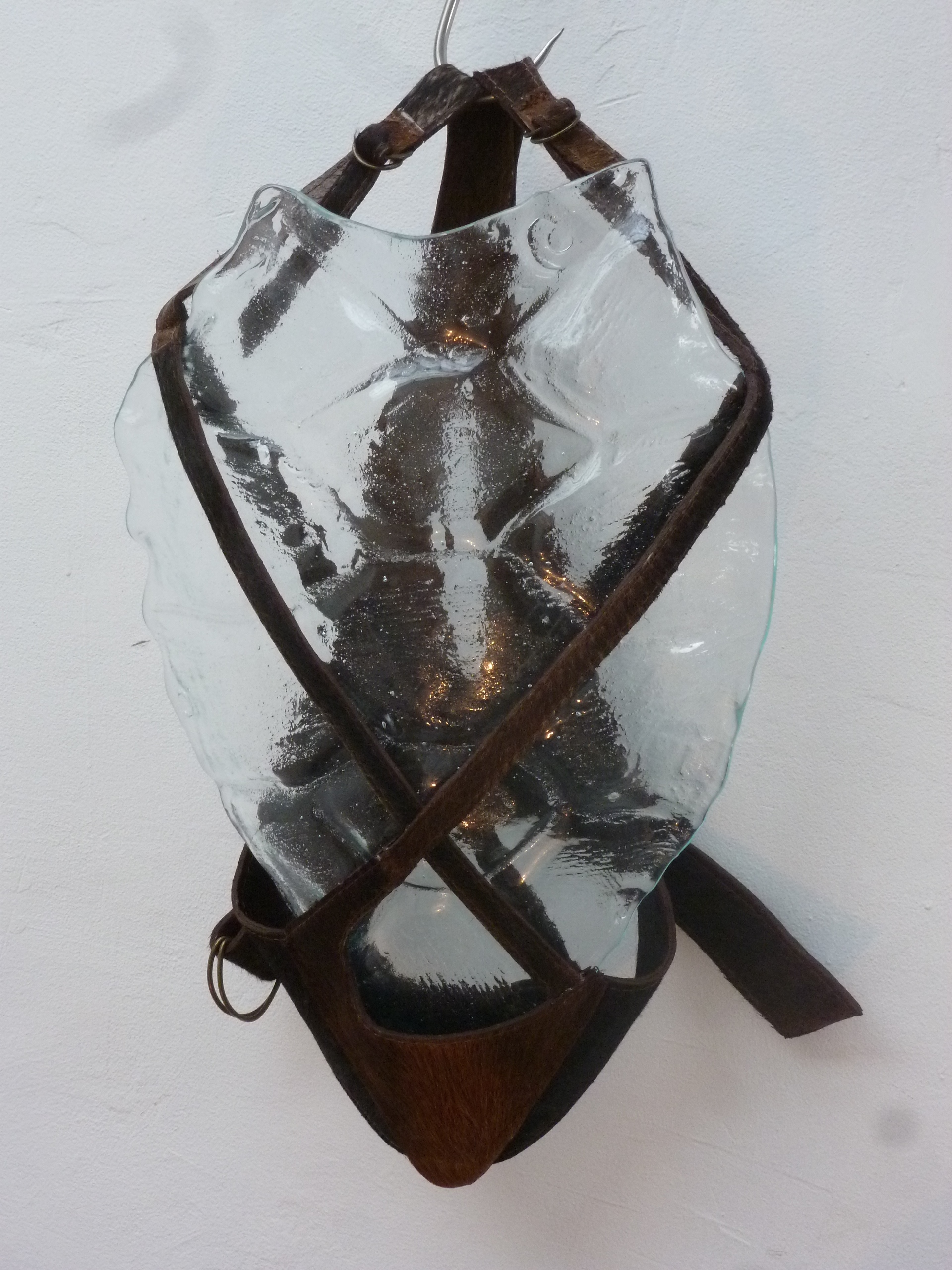 L’entreprise de longs et périlleux voyage met à nu l’individu. Ce sac à dos en verre laisse percevoir la fragilité de celui qui la porte, la dangerosité du déplacement. La carapace de verre évoque les dangers rencontrés et la perte d’un lieu protecteur ou sensé l’être, le pays d’origine. Elle devient l’ultime abri de l’individu, fragile, transparent, sans intimité et peu efficace. Le cuir est celui d’un bovidé migrateur, en quête de nourriture et d’eau, eau qui peut aussi être un obstacle dans la migration.